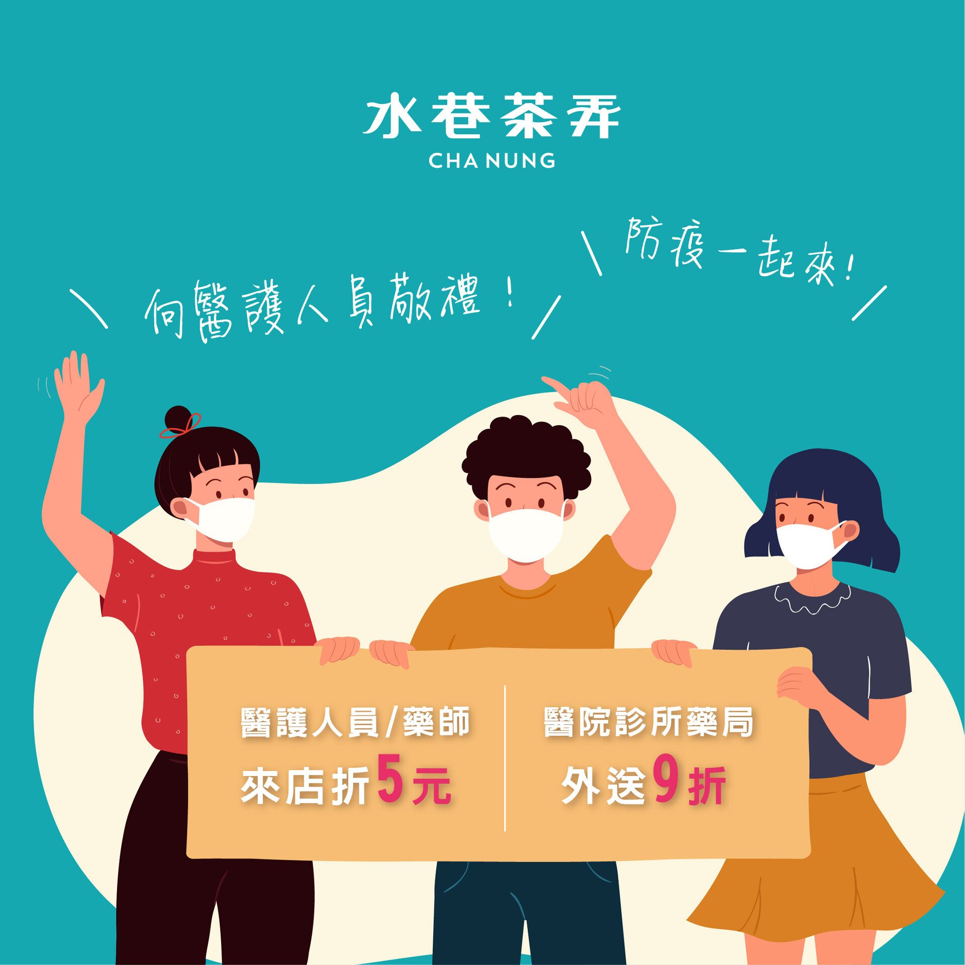 針對所有醫護人員/藥師以及醫療院所(醫院/診所/藥局),水巷茶弄推出專屬優惠,為在前線奮鬥的你們加油。👊👊👊
