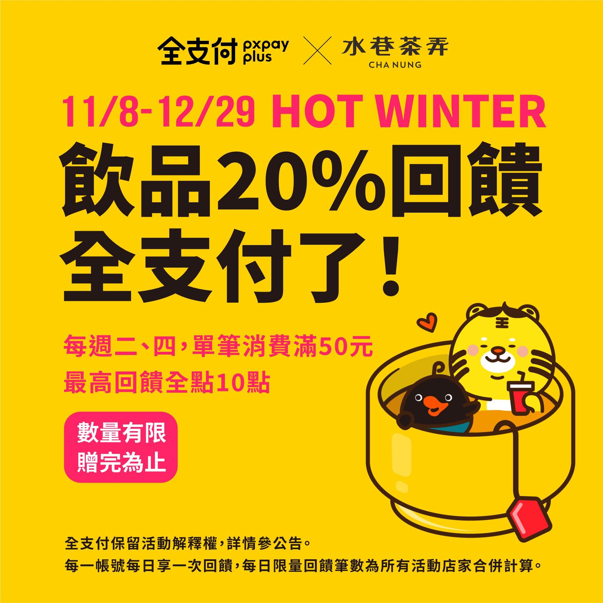 🕗2022/11/8-12/29每周二、四,至水巷茶弄門巿消費滿50元,使用全支付,最高享20%回饋 (單筆最高回饋10點、每一帳號每日限享1次回饋) 每日限量10,000筆,數量有限,手腳要快。