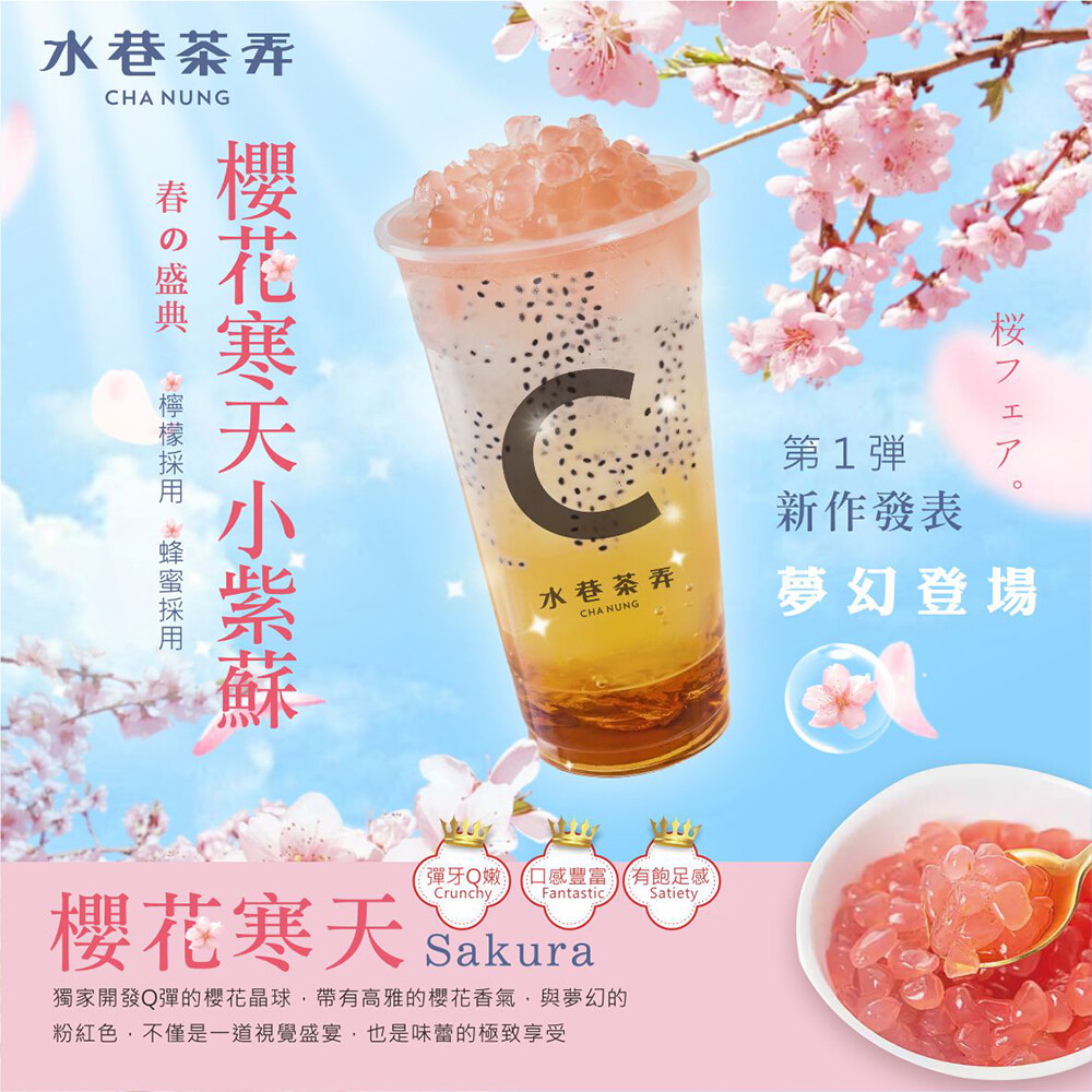 獨家開發的夢幻粉色櫻花寒天,與愛玉、小紫蘇搭配,三料豐富層次的咀嚼口感,以及充滿春天氣息的獨特花果香氣,讓人不得不愛~